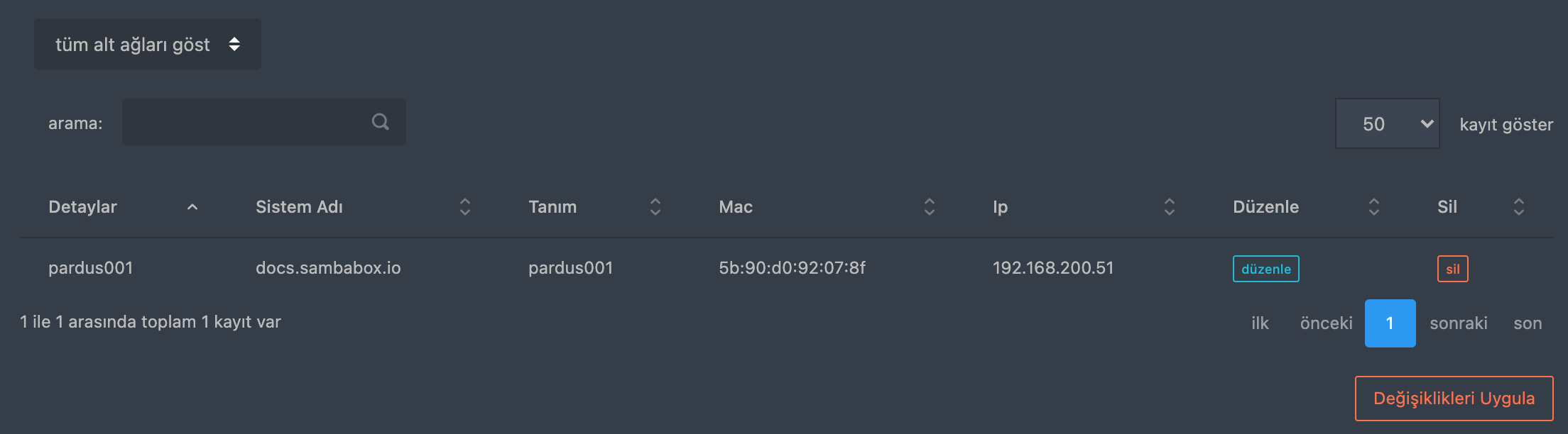 Rezervasyonlar sayfasında DHCP sunucu üzerinde daha önceden rezerve edilmiş ağ adı ve IP bilgileri listelenir.