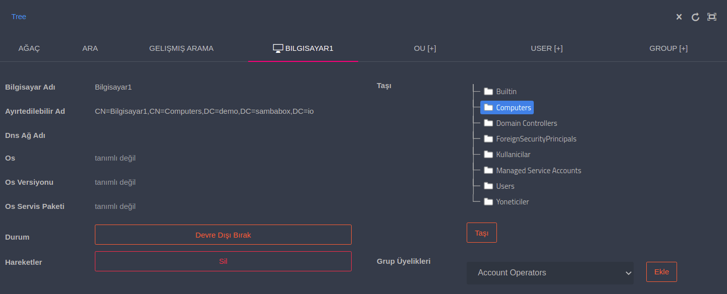 SambaBox aktif dizinindeki bilgisayarlara ait işlemler için bilgisayar nesnesi üzerinde sağ tık yapılarak Düzenleme ve Silme işlemlerini yapabilirsiniz.
