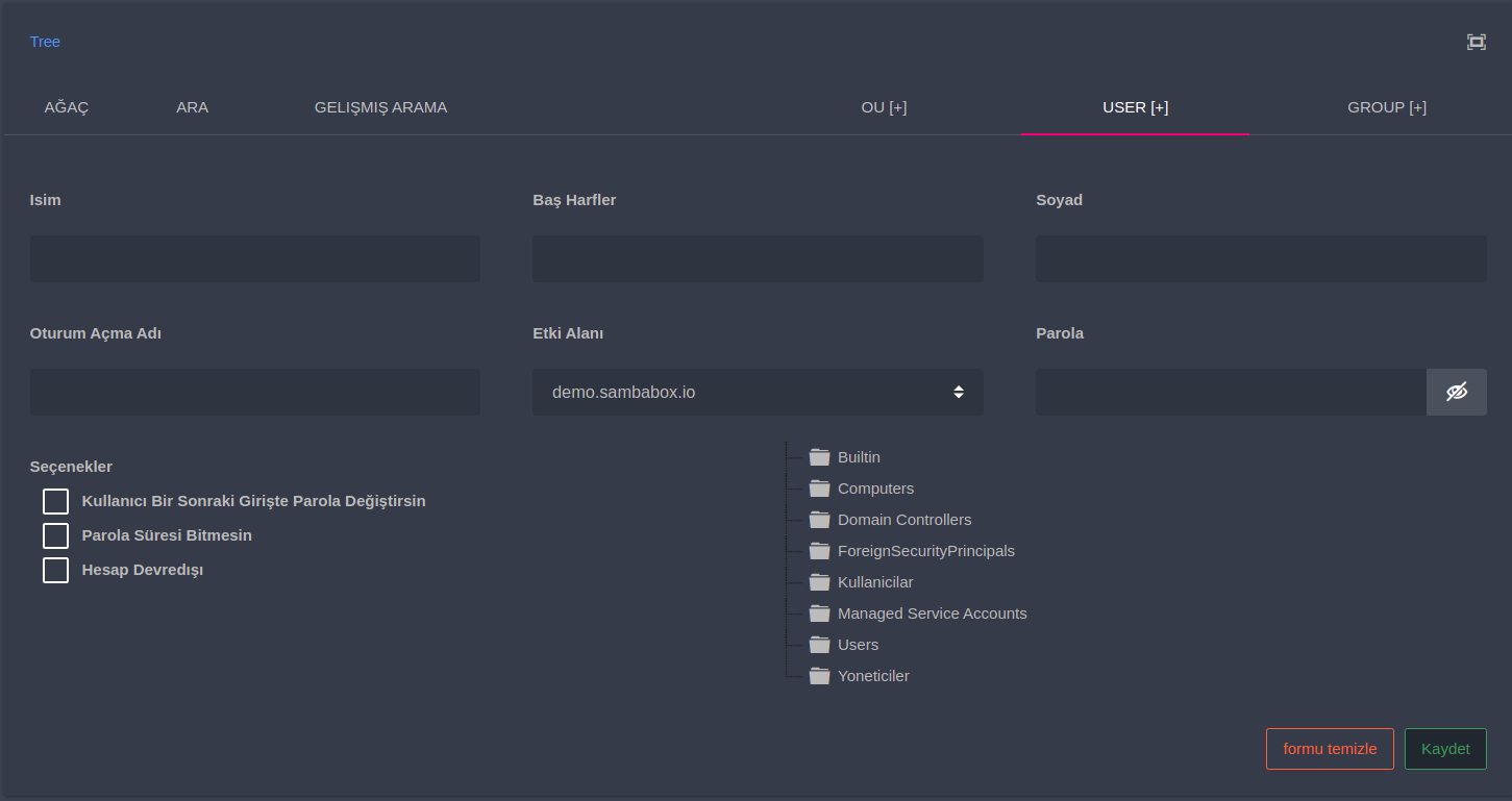 Kullanıcının ekleneceği organiasyon birimini, aktif dizin ağaç yapısı içerisinden seçebilirsiniz.