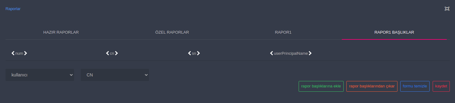 Bu ekranda varsayılan olarak hazırlanmış rapor başlıklarına başka öznitelikler ekleyebilir ya da çıkarabilirsiniz.