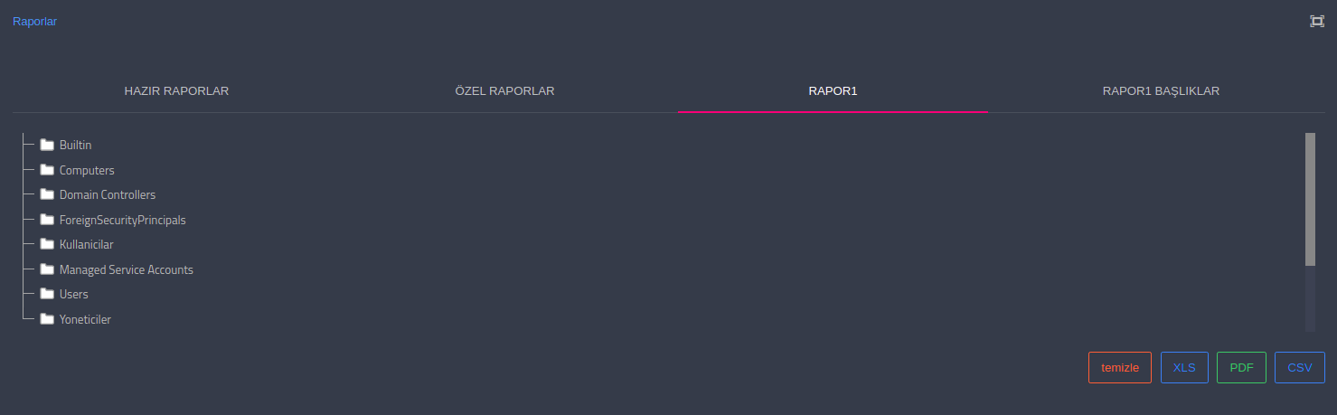 SambaBox Aktif Dizin veritabanınızdaki verileri rapor olarak (çeşitli formatlarda pdf, csv, xls) dışarı aktarmanıza olanak sağlar.