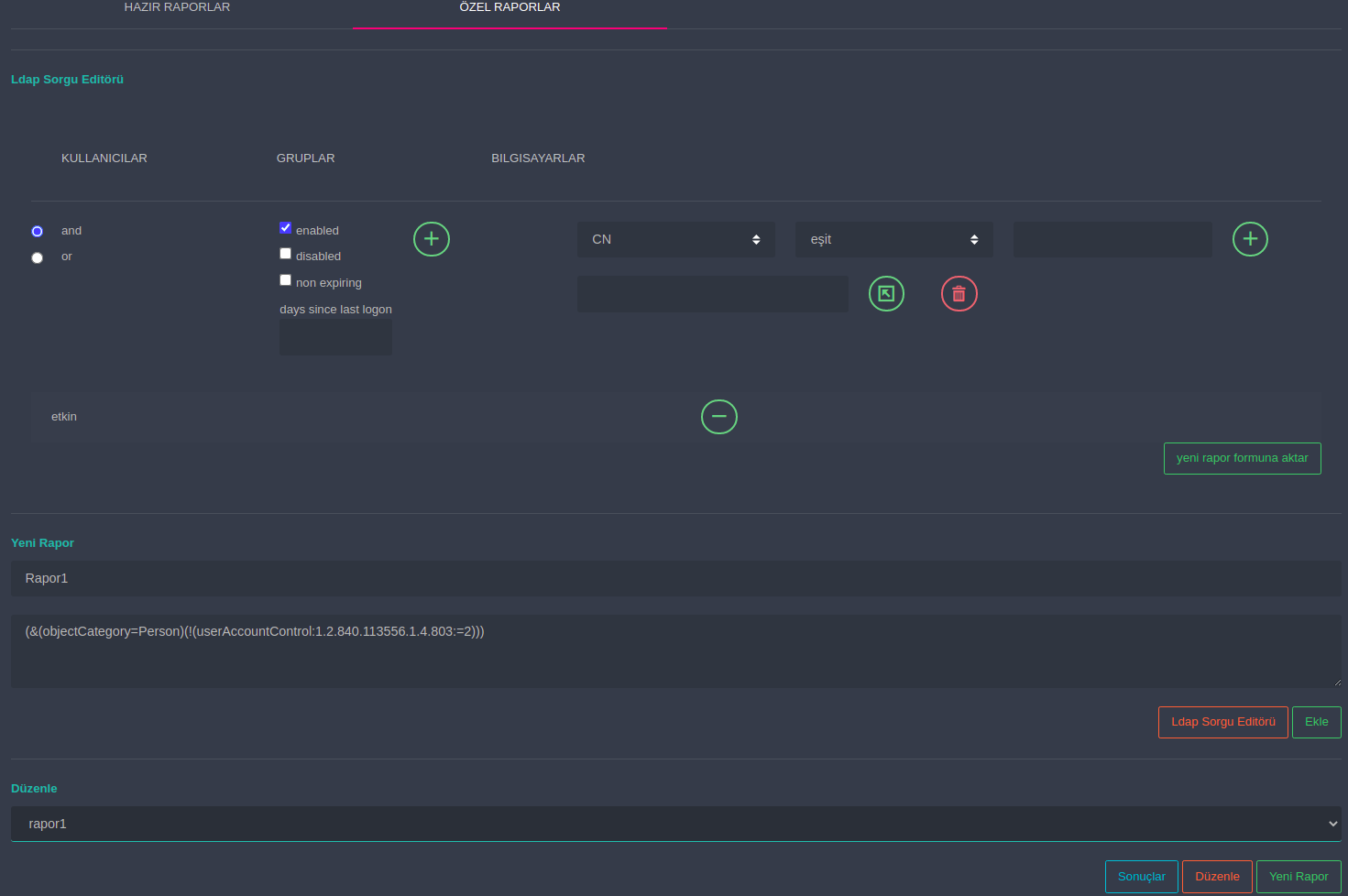 Bu ekranda, Kullanıcı, Grup ve Bilgisayarları çeşitli kriterlere göre raporlayabilirsiniz. Rapor için aramaları birden fazla kriter seçerek ve/veya tipinde yapabilirsiniz. Arama kriterini seçip [+] butonuna, daha sonra [Yeni Rapor Formuna Aktar] butonuna basarak rapor için aramayı gerçekleştirebilirsiniz.