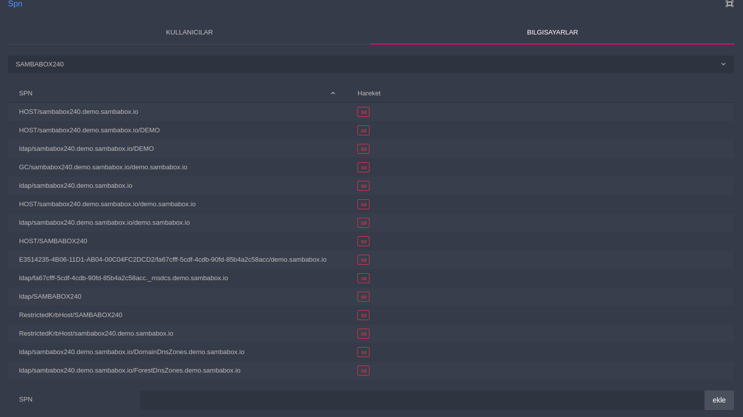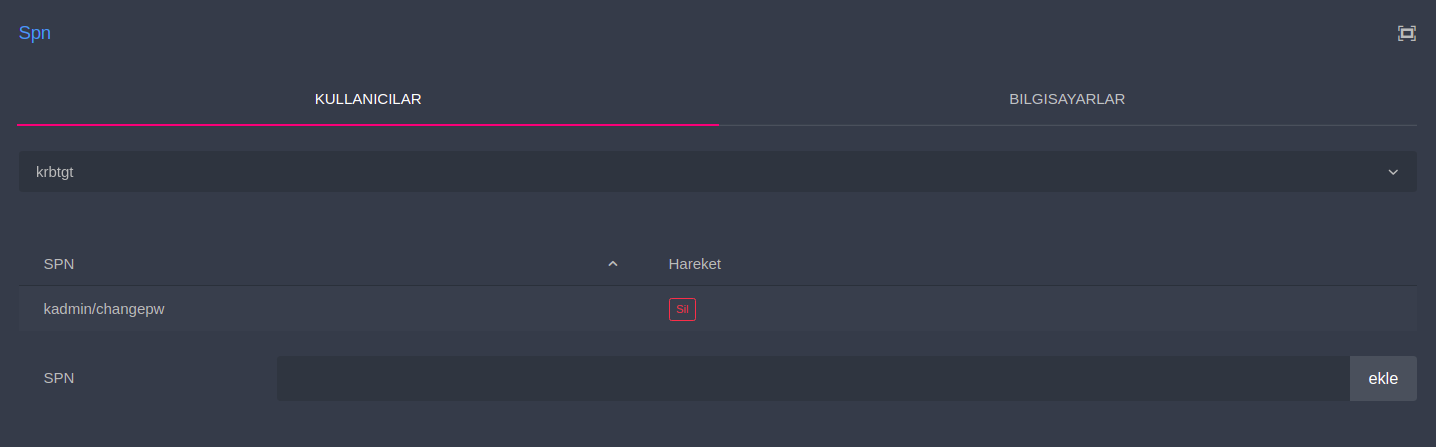Bu ekranlardan kullanıcılarda bulunan SPN kayıtlarını listeleyebilir, ekleyebilir ya da silebilirsiniz.