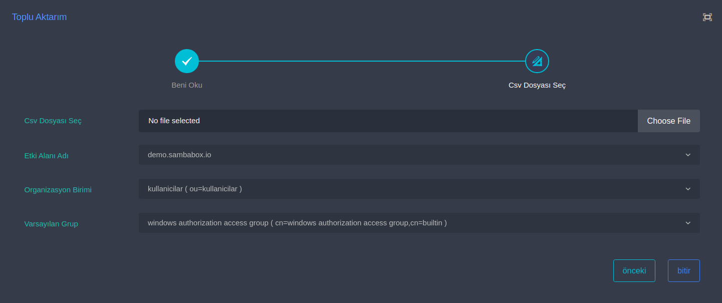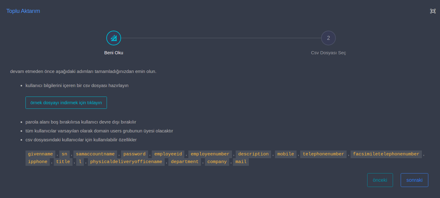 Hazırlayacağınız CSV dosyasında givenname,sn,samaccount ile password alanları zorunludur.Diğer seçilebilir özellikler ile bilgileri Toplu Aktarım Sayfasında bulabilirsiniz.