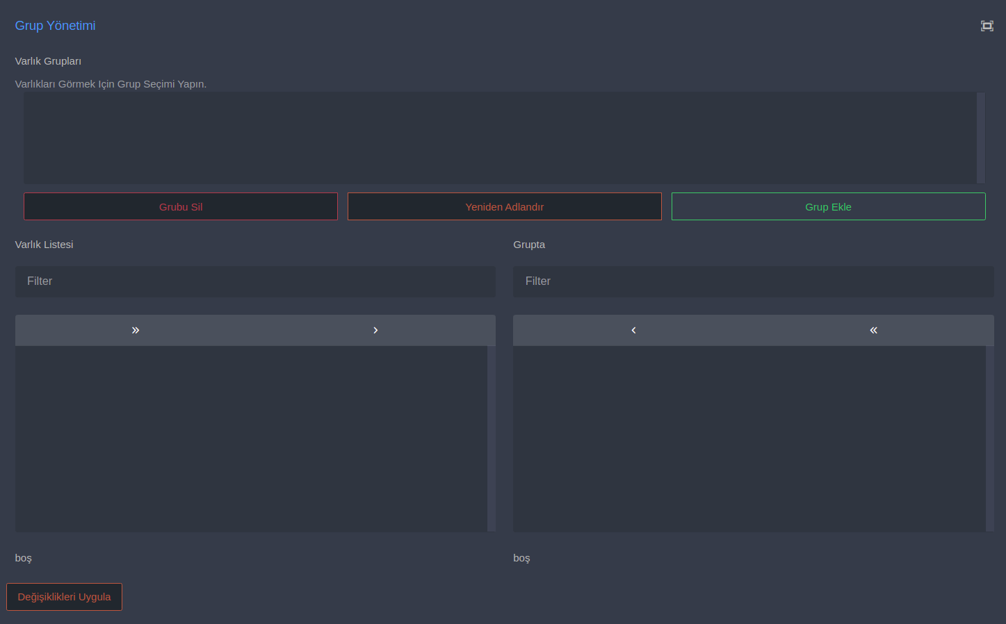 Grup yönetimi kısmında sisteme dahil olmuş varlıklar için gruplar oluşturulur. Grup tanımları, bir işin birçok varlığa (istemciye) aynı anda gönderilmesi için gereklidir. Özel kullanıcı grupları oluşturup yönetin.