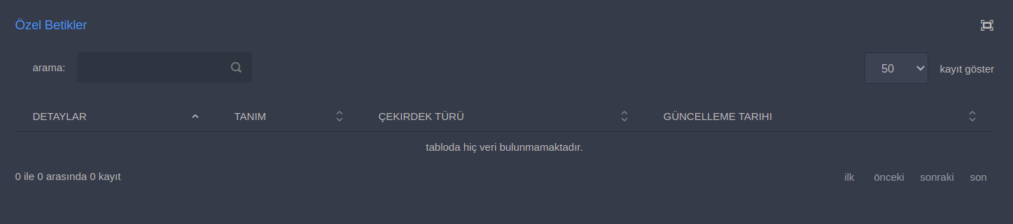 Sistem yöneticisi tarafından, Özel Betik Ekle menüsü kullanılarak hazırlanmış betikler bu ekranda listelenir.
