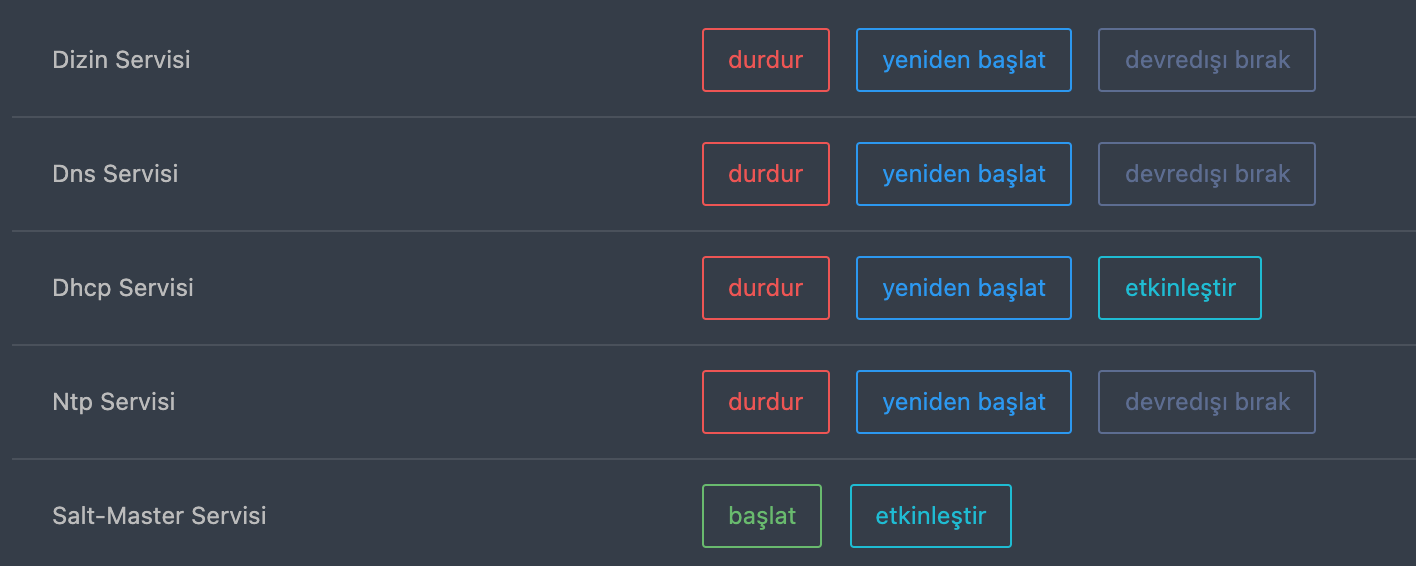 Bu ekrandan SambaBox içerisinde Dizin, DNS, DHCP, NTP ve Salt-Master servislerini durduranilir, yeniden başlatabilir, sunucu açılışında çelışmasını engellemek için devre dışı bırakabilirsiniz.