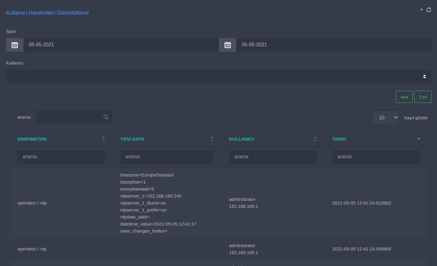 SambaBox arayüzünde yapılan Kullanıcı hareketlerini görüntüleyebilir, arama yapabilir ve gerekirse CSV formatında indirebilirsiniz.