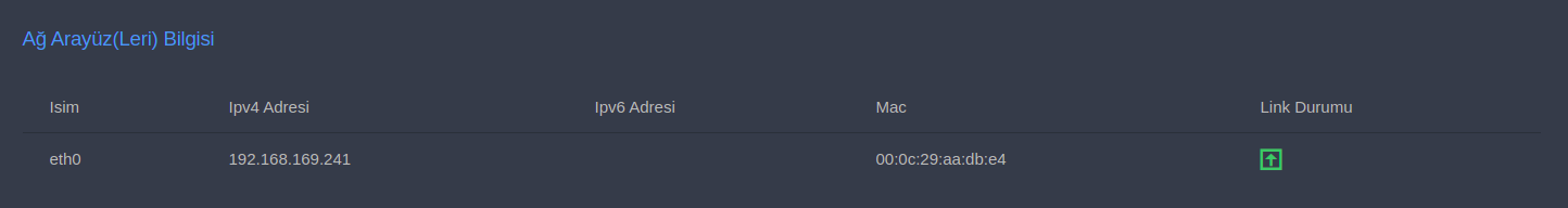 Ağ Arayüzleri Bilgisi tablosunda SambaBox sunucuda bulunan ağ kartları, tanımlı IP adresleri, donanım adresleri ve link durumlarını listeleyin.