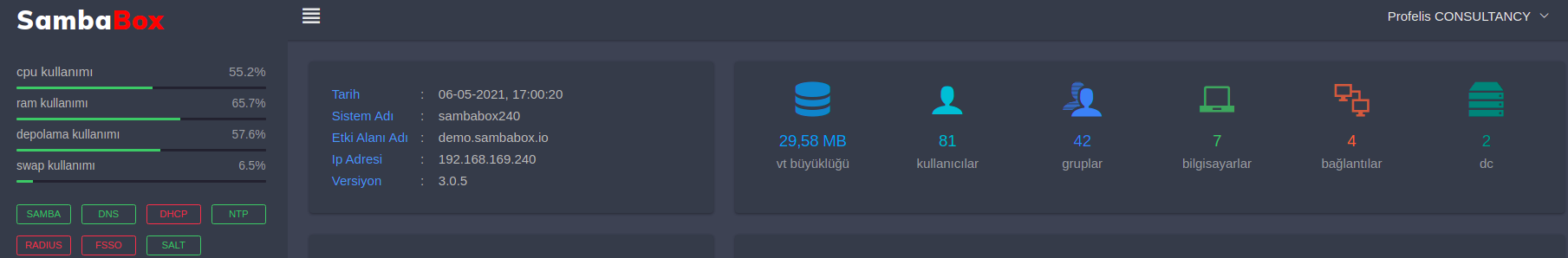 Göç işlemi tamamlandıktan sonra otomatik yönlendirme ile ana ekrana (dashboard) geçilir. Ana ekranda Etki Alanı na ait bilgiler ile Servislerin çalıştığını doğrulayın.