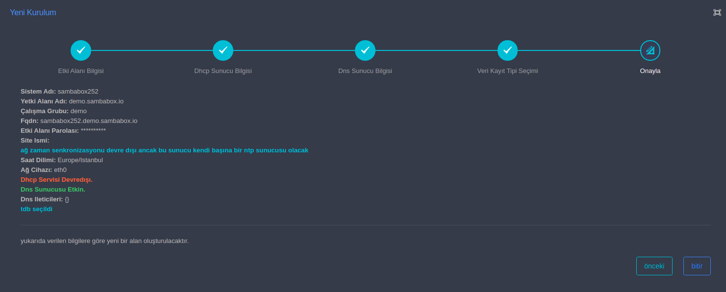 Onayla ekranında oluşturulan yapı kontrol edilir. Yapılan yapılandırma da değişiklik isteniyor ise [Önceki] butonu ile önceki adımlara dönülerek ayarlar değiştirilebilir. [Bitir] butonuna basıp SambaBox sunucuyu yeni ayarlar ile yeniden yapılandırın.