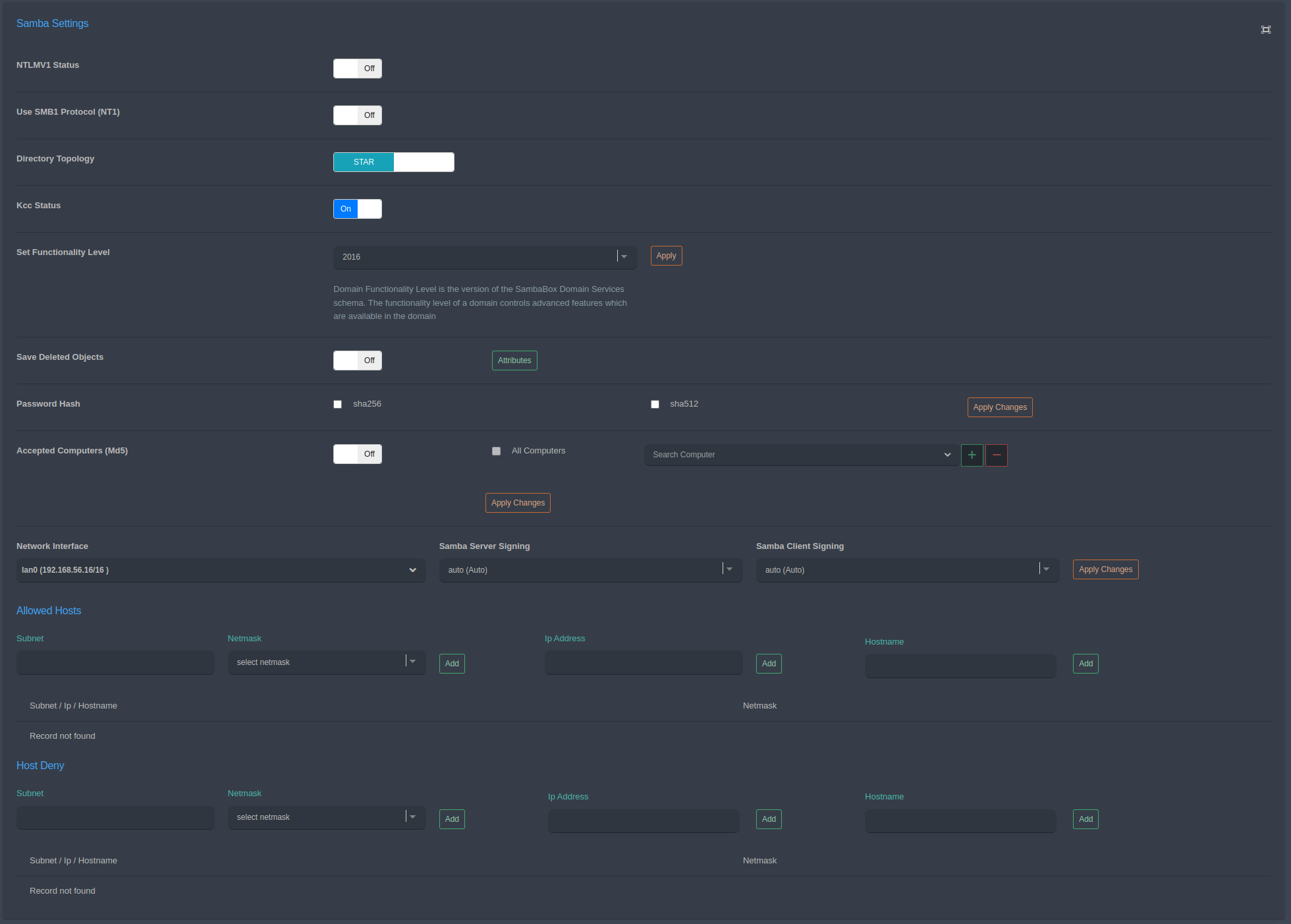 Network Interface: - This option selects the network interface to be used by the Samba server. “lan0 (192.168.0.10/24)” is selected.