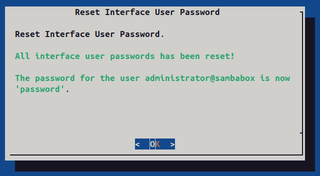 Arayüz kullanıcı şifresini sıfırlama ekranıdır. Bu Seçeneğe tıklandığında kullanıcı ismi şifre administrator@sambabox ve ‘password’ olur.